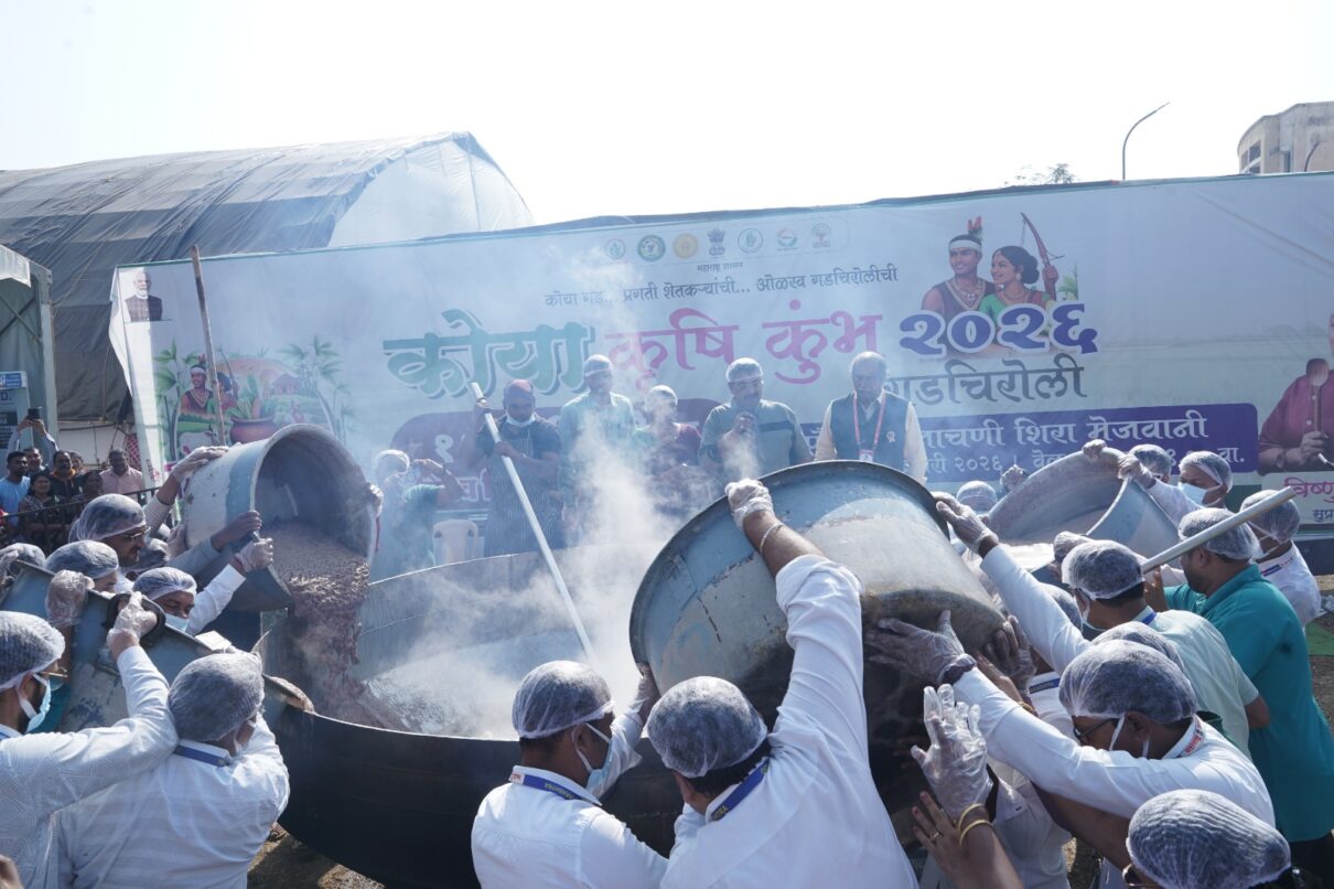 कृषी संस्कृती आणि स्थानिक उत्पादनांना जागतिक व्यासपीठ मिळवून देण्याच्या उद्देशाने आयोजित ‘कोया कृषी कुंभ २०२६’ या भव्य कृषी महोत्सवात आज एक ऐतिहासिक क्षण साकार झाला. प्रसिद्ध आचारी विष्णु मनोहर यांच्या नेतृत्वाखाली तब्बल ११११ किलो नाचणीचा शिरा तयार करून जागतिक विक्रम प्रस्थापित करण्यात आला. या उपक्रमामुळे गडचिरोली जिल्ह्यातील भरडधान्ये, विशेषतः नाचणी पिकाचे पोषणमूल्य आणि महत्त्व राष्ट्रीय-आंतरराष्ट्रीय स्तरावर अधोरेखित झाले.